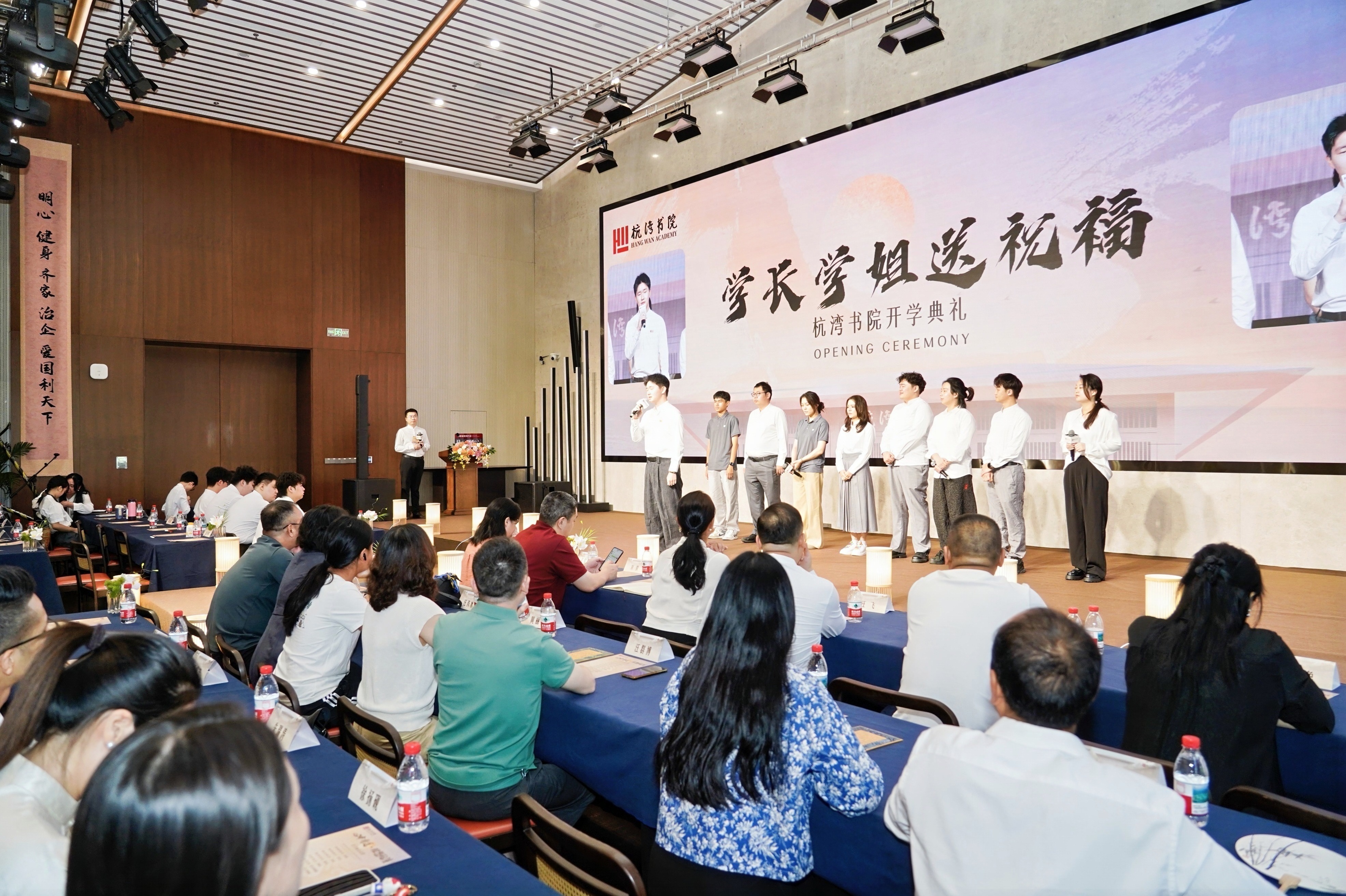 其后,三期班主任为新生佩戴院徽,标志着他们正式成为杭湾书院学子,踏上追求“有道企业领袖”理想的新征程。